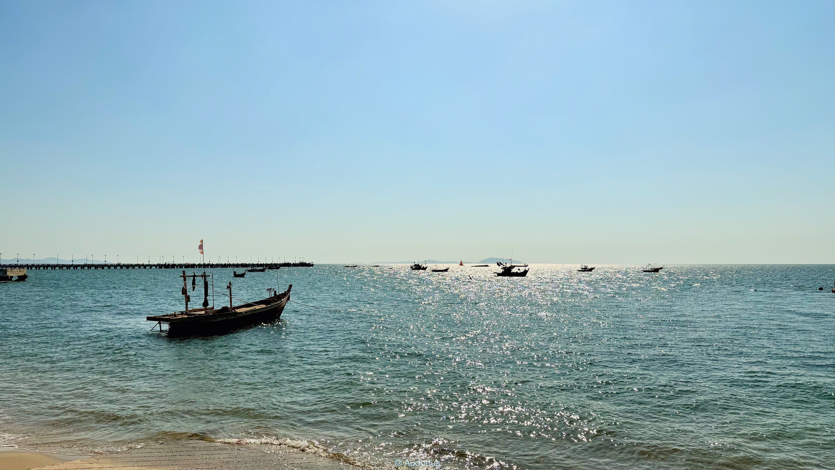 Recently, I went to Won Napa Beach. By chance, I discovered a magnificent view when I turned my face toward the sea. The water surrounding the boats—around eight or nine small boats scattered in the distance, with a larger one in the foreground—was shining and twinkling in the sunlight.